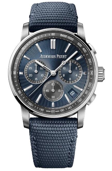 Ref. 26238OR.OO.2000OR.01: A 42mm 18K rose gold case with a blue “Petite Tapisserie” dial, powered by the Calibre 4404 automatic flyback chronograph movement, combining luxury and practicality.